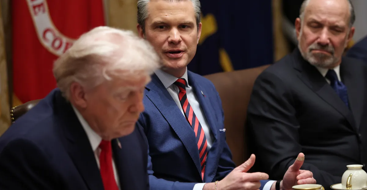 WASHINGTON, DC – JANUARY 29: U.S. Secretary of War Pete Hegseth (C) speaks during a meeting of the Cabinet as…
